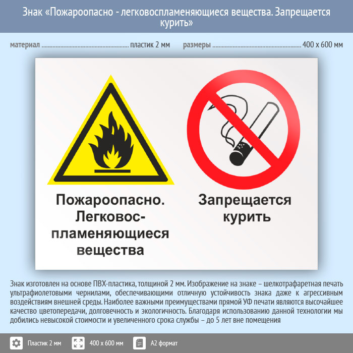 Знак «Пожароопасно - легковоспламеняющиеся вещества. Запрещается курить», КЗ-69 (пластик, 600х400 мм) в Волгограде купить