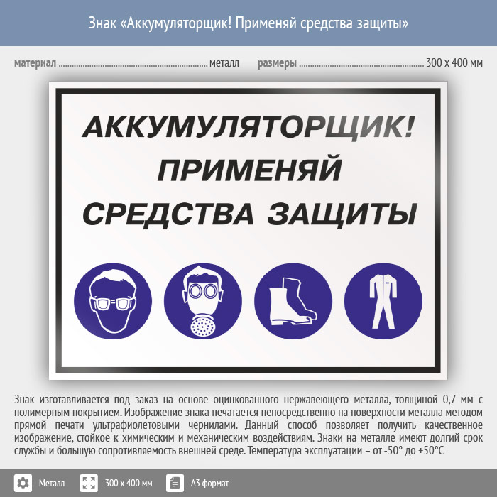 Знак «Аккумуляторщик! Применяй средства защиты», КЗ-02 (металл, 400х300 мм) в Волгограде купить