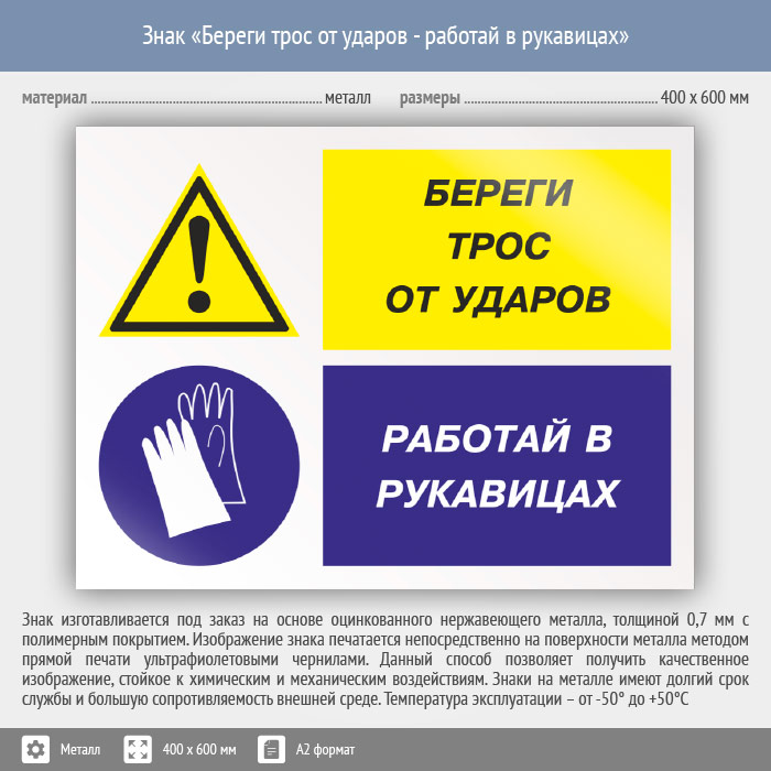 Знак «Береги трос от ударов - работай в рукавицах», КЗ-03 (металл, 600х400 мм) в Волгограде купить