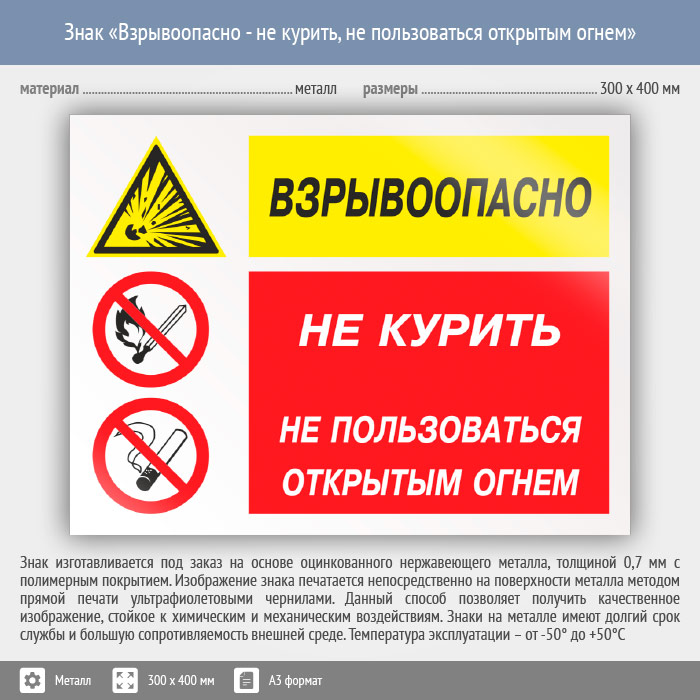 Знак «Взрывоопасно - не курить, не пользоваться открытым огнем», КЗ-05 (металл, 400х300 мм) в Волгограде купить