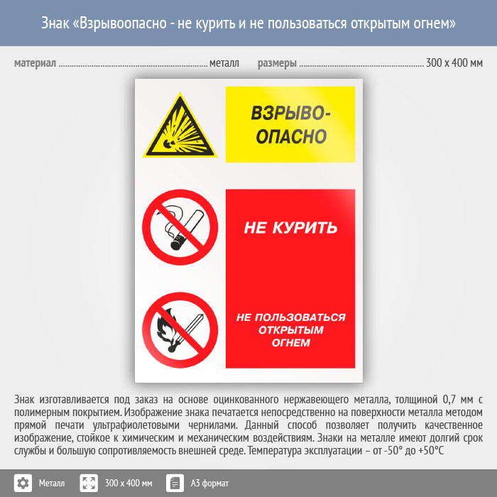 Знак «Взрывоопасно - не курить и не пользоваться открытым огнем», КЗ-08 (металл, 300х400 мм) в Волгограде купить