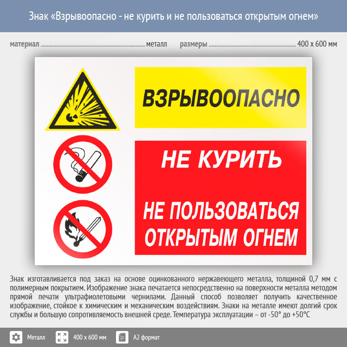 Знак «Взрывоопасно - не курить и не пользоваться открытым огнем», КЗ-09 (металл, 600х400 мм) в Волгограде купить