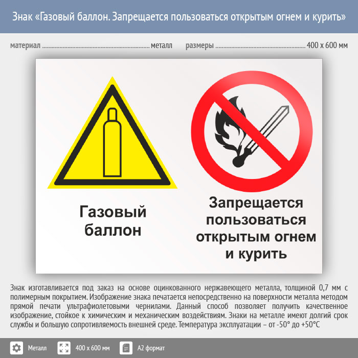 Знак «Газовый баллон. Запрещается пользоваться открытым огнем и курить», КЗ-19 (металл, 600х400 мм) в Волгограде купить