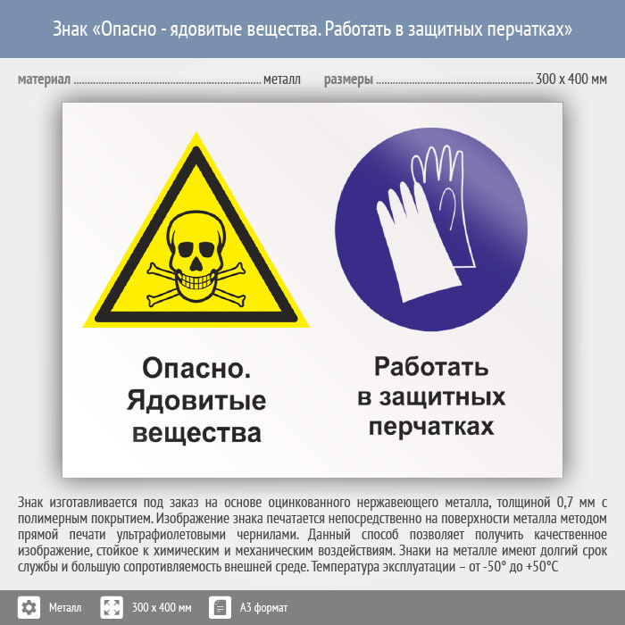 Знак «Опасно - ядовитые вещества. Работать в защитных перчатках», КЗ-43 (металл, 400х300 мм) в Волгограде купить