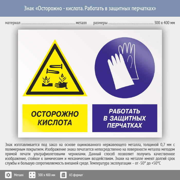 Знак «Осторожно - кислота. Работать в защитных перчатках», КЗ-56 (металл, 400х300 мм) в Волгограде купить