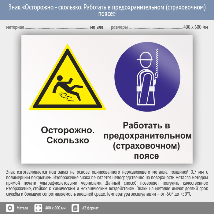 Знак «Осторожно - скользко. Работать в предохранительном (страховочном) поясе», КЗ-58 (металл, 600х400 мм) в Волгограде купить