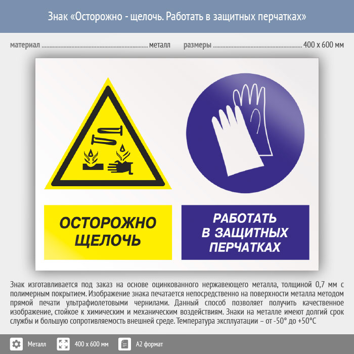 Знак «Осторожно - щелочь. Работать в защитных перчатках», КЗ-60 (металл, 600х400 мм) в Волгограде купить