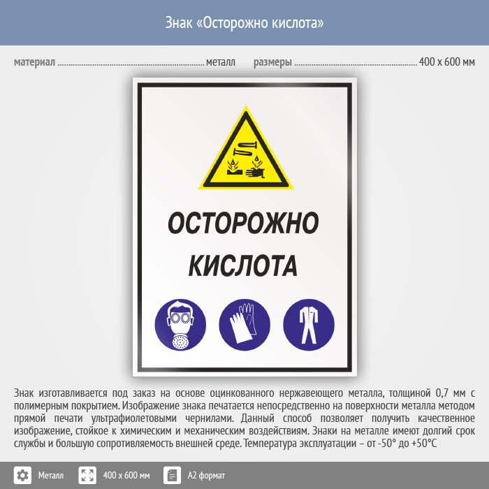 Знак «Осторожно кислота», КЗ-61 (металл, 400х600 мм) в Волгограде купить