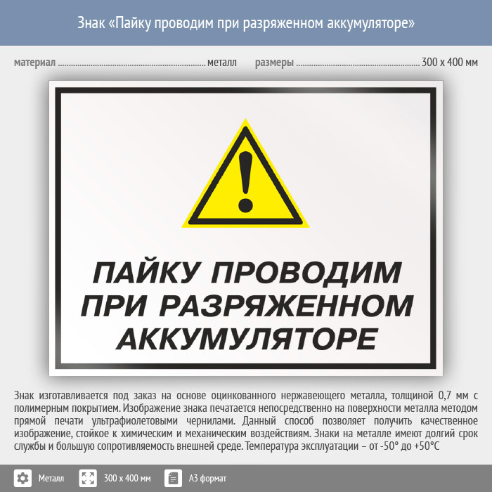 Знак «Пайку проводим при разряженном аккумуляторе», КЗ-62 (металл, 400х300 мм) в Волгограде купить