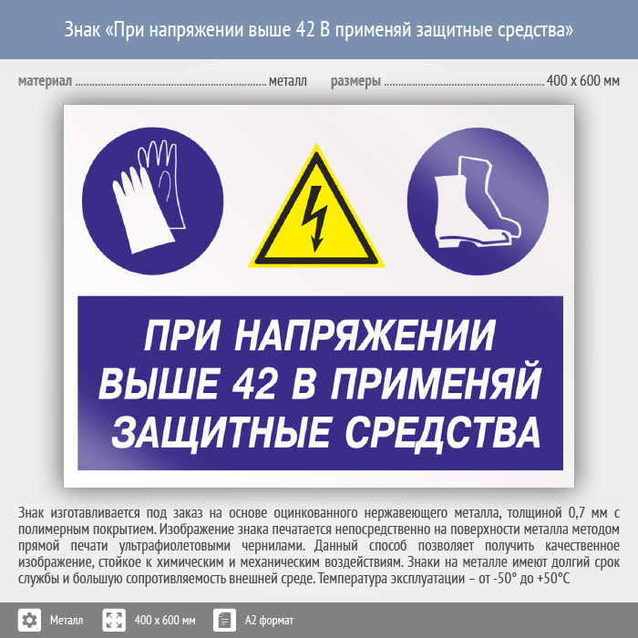 Знак «При напряжении выше 42 В применяй защитные средства», КЗ-72 (металл, 600х400 мм) в Волгограде купить