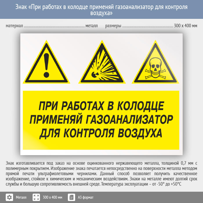 Знак «При работах в колодце применяй газоанализатор для контроля воздуха», КЗ-74 (металл, 400х300 мм) в Волгограде купить
