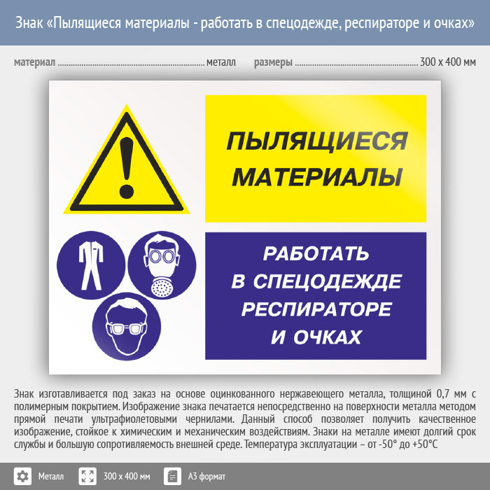 Знак «Пылящиеся материалы - работать в спецодежде, респираторе и очках», КЗ-79 (металл, 400х300 мм) в Волгограде купить