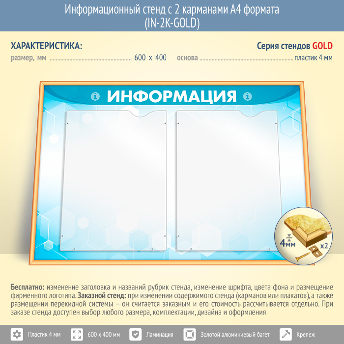 Информационный стенд с 2 карманами А4 формата (IN-2K-GOLD) в Волгограде купить
