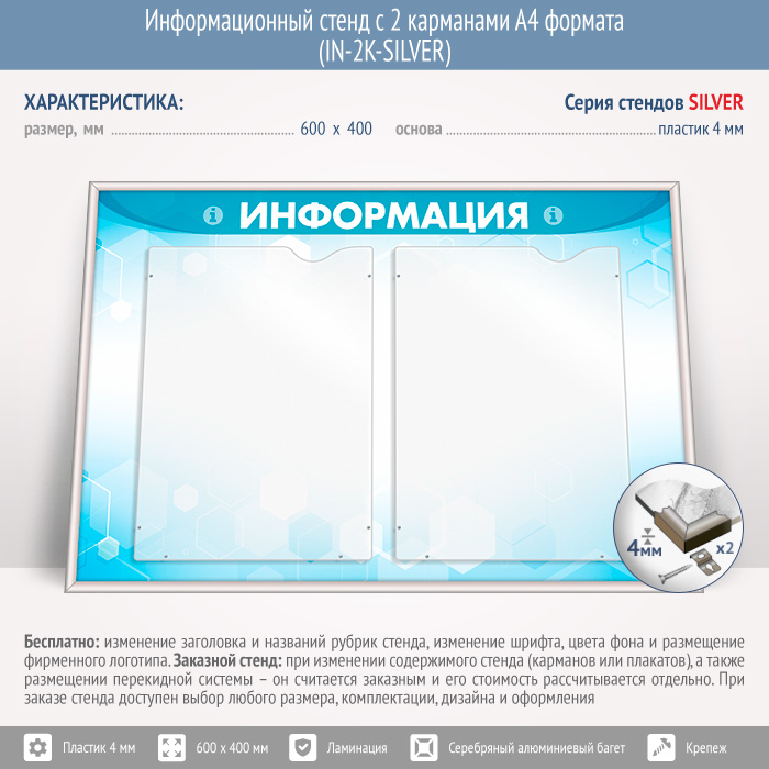 Информационный стенд с 2 карманами А4 формата (IN-2K-SILVER) в Волгограде купить