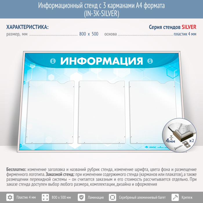 Информационный стенд с 3 карманами А4 формата (IN-3K-SILVER) в Волгограде купить