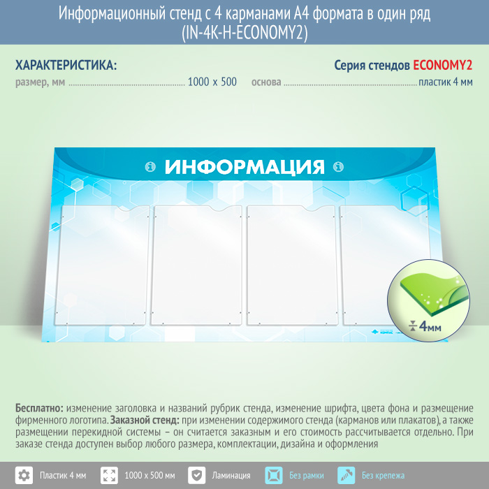 Информационный стенд с 4 карманами А4 формата в один ряд (IN-4K-H-ECONOMY2) в Волгограде купить
