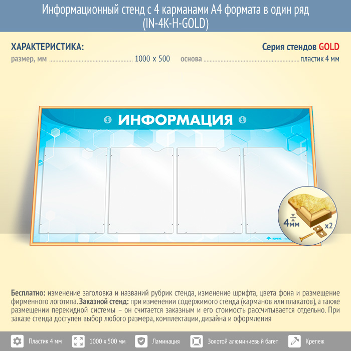 Информационный стенд с 4 карманами А4 формата в один ряд (IN-4K-H-GOLD) в Волгограде купить