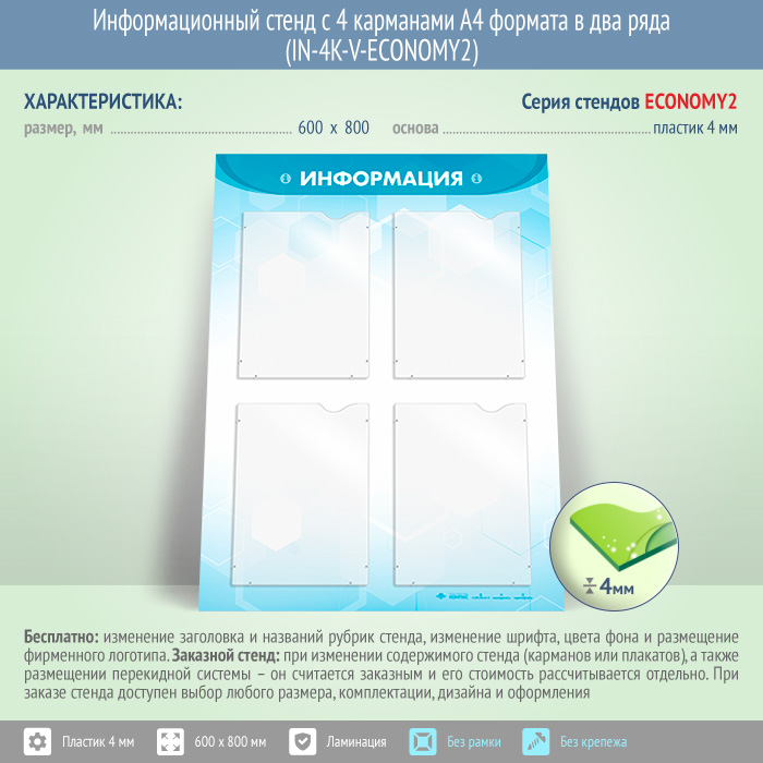 Информационный стенд с 4 карманами А4 формата в два ряда (IN-4K-V-ECONOMY2) в Волгограде купить