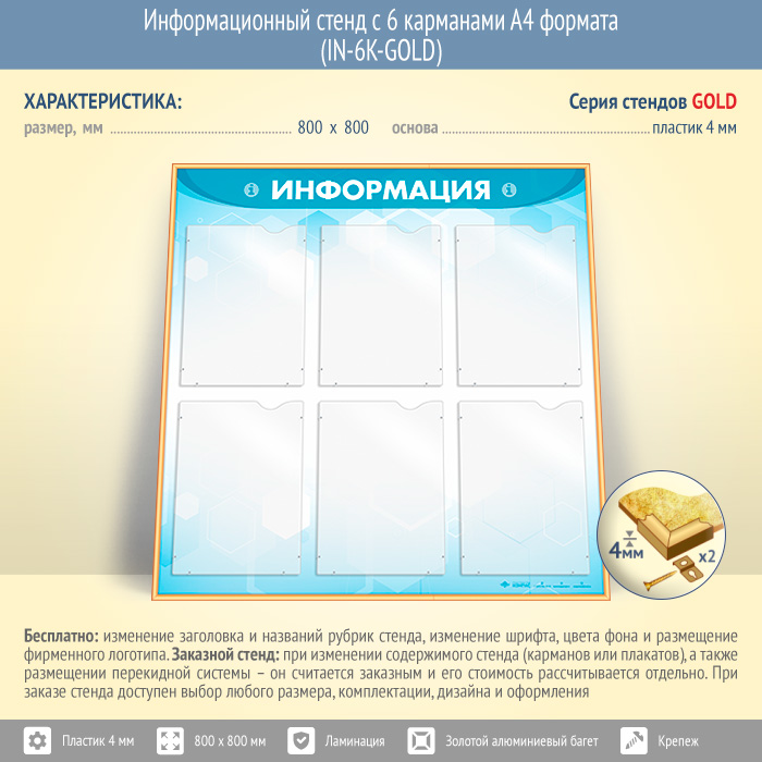 Информационный стенд с 6 карманами А4 формата (IN-6K-GOLD) в Волгограде купить