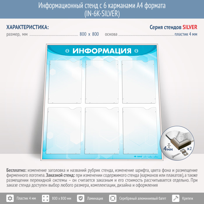 Информационный стенд с 6 карманами А4 формата (IN-6K-SILVER) в Волгограде купить