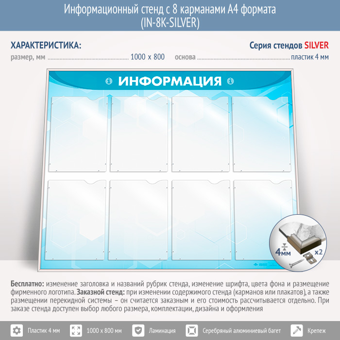 Информационный стенд с 8 карманами А4 формата (IN-8K-SILVER) в Волгограде купить