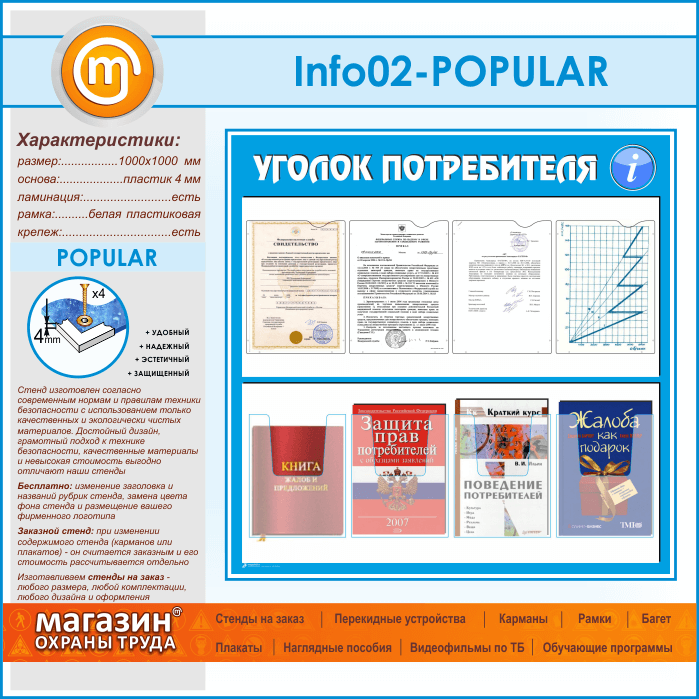 Стенд «Уголок потребителя» с 4 плоскими и 4 объемными карманами А4 формата (IN-02-POPULAR) в Волгограде купить