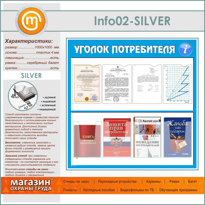 Стенд «Уголок потребителя» с 4 плоскими и 4 объемными карманами А4 формата (IN-02-SILVER) в Волгограде купить