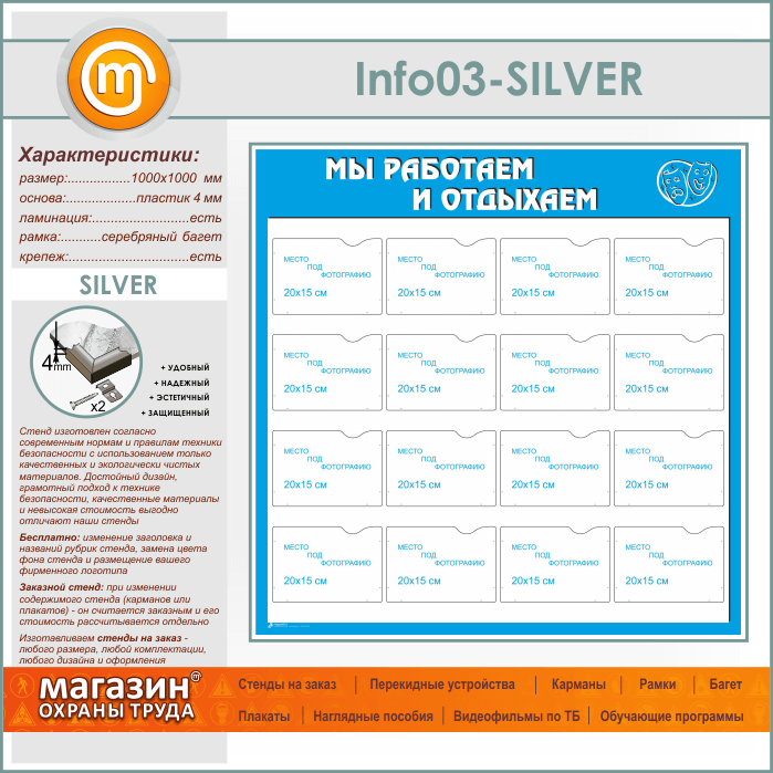 Стенд «Мы работаем и отдыхаем» с 16 карманами А5 формата (IN-03-SILVER) в Волгограде купить