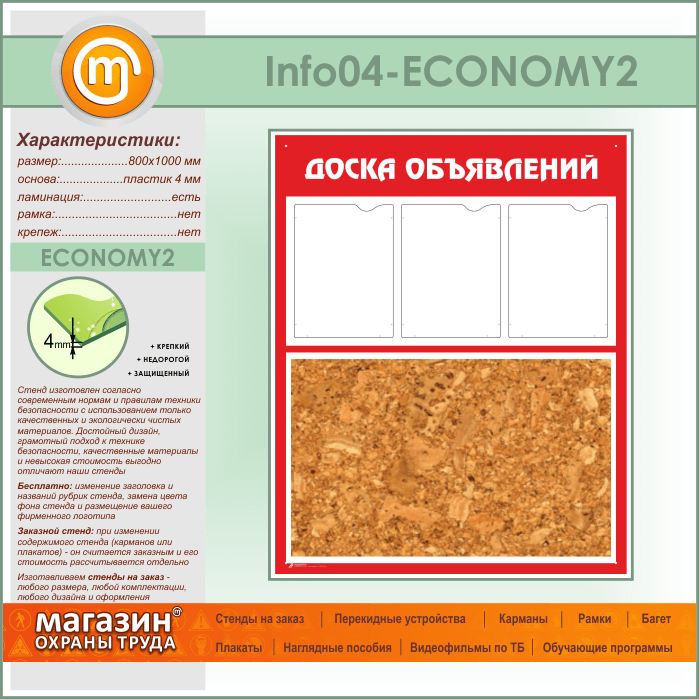 Стенд «Доска объявлений» с пробковым полотном и 3 карманами А4 формата (IN-04-ECONOMY2) в Волгограде купить