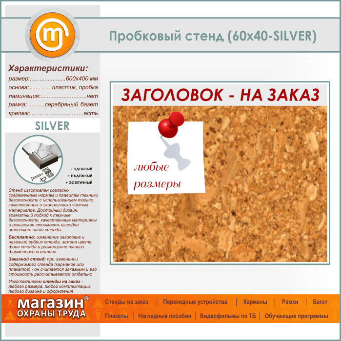 Пробковая доска с заголовком, 60х40 см (IN-06-SILVER) в Волгограде купить