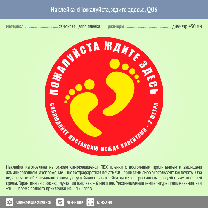 Наклейка на пол «Пожалуйста, ждите здесь», Q03 (пленка c ламинированием, диаметр 450 мм) в Волгограде купить