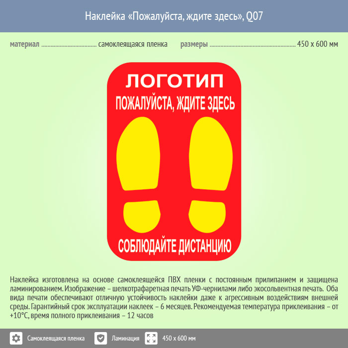 Наклейка на пол «Пожалуйста, ждите здесь», Q07 (пленка c ламинированием, 450х600 мм) в Волгограде купить