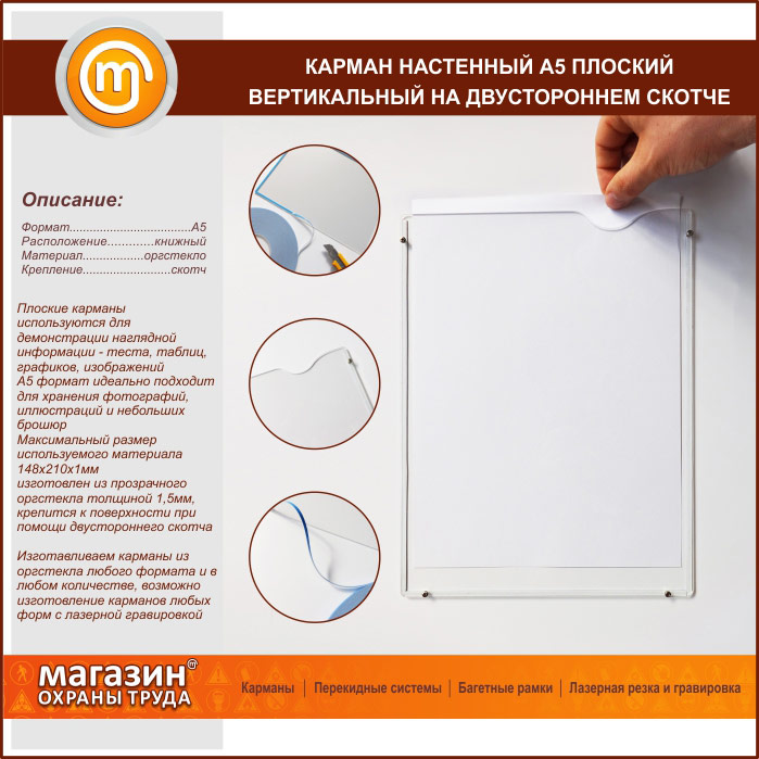 Карман настенный А5 плоский вертикальный на двустороннем скотче в Волгограде купить