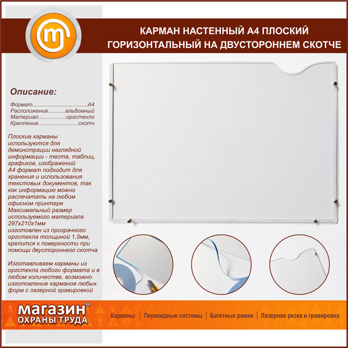 Карман настенный А4 плоский горизонтальный на двустороннем скотче в Волгограде купить
