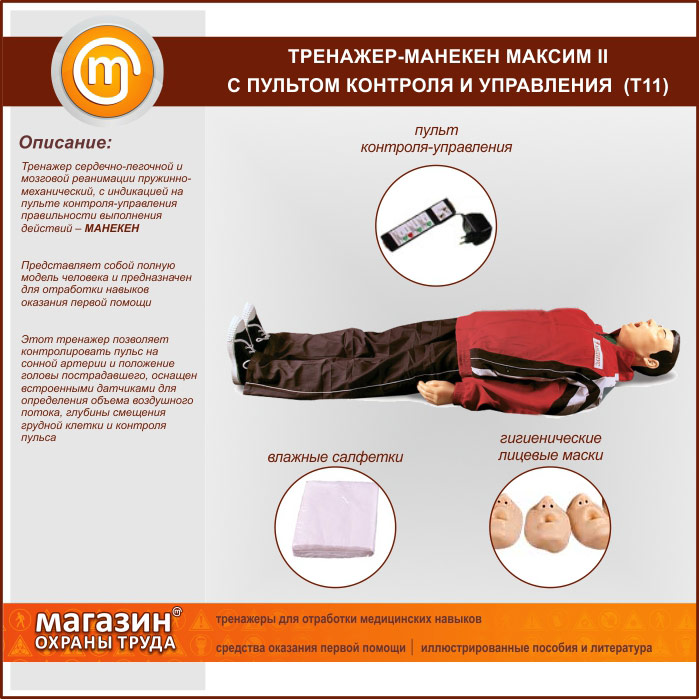 | Тренажер сердечно-легочной и мозговой реанимации «Максим II-01», Т11 В/Р (пружинно-механический с индикацией правильности выполнения действий, манекен) | Тренажер сердечно-легочной и мозговой реанимации «Максим II-01», Т11 В/Р (пружинно-механический с индикацией правильности выполнения действий, манекен) |