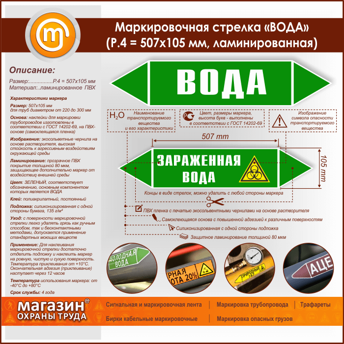 Маркировочная стрелка «ВОДА» (P.4 = 507х105 мм, самоклеящаяся плёнка с ламинированием) в Волгограде купить