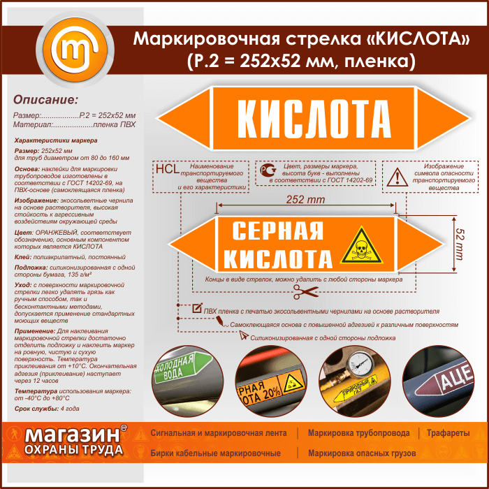 Маркировочная стрелка «КИСЛОТА» (P.2 = 252х52 мм, самоклеящаяся плёнка) в Волгограде купить