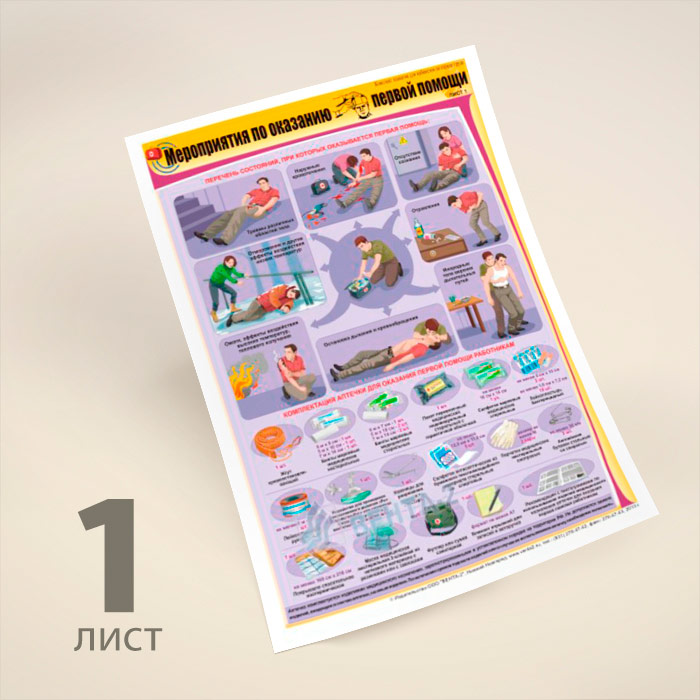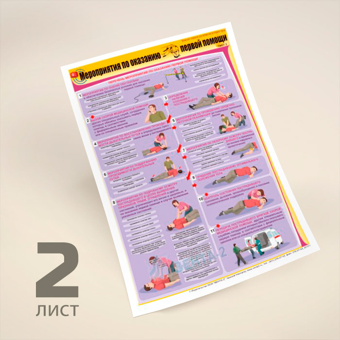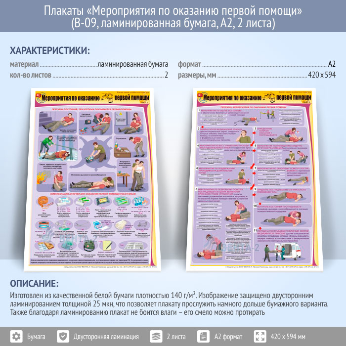 Плакаты «Мероприятия по оказанию первой помощи» (В-09, ламинированная бумага, А2, 2 листа) в Волгограде купить