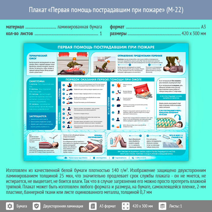 Плакат «Первая помощь пострадавшим при пожаре» (М-22, ламинированная бумага, А3, 1 лист) в Волгограде купить