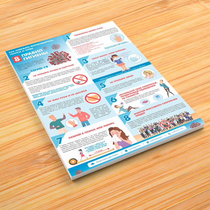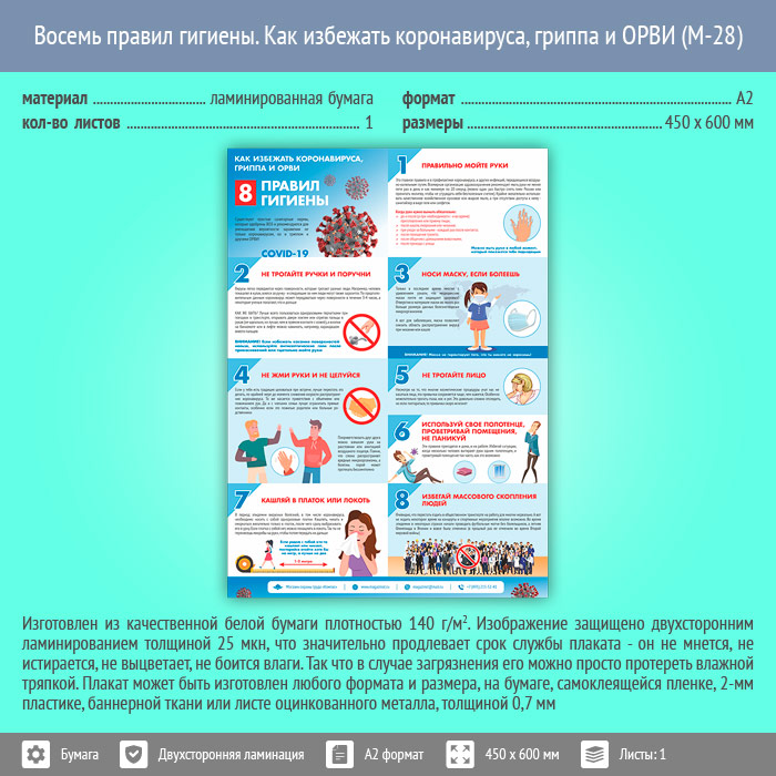 Плакат «Восемь правил гигиены. Как избежать коронавируса, гриппа и ОРВИ» (М-28, ламинированная бумага, А2, 1 лист) в Волгограде купить