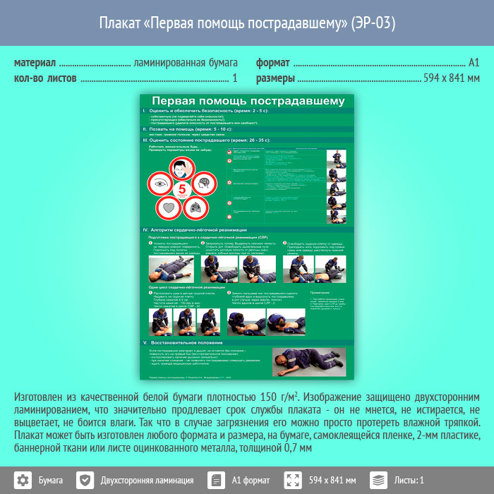 Плакат «Первая помощь пострадавшему» (ЭР-03, ламинированная бумага, А1, 1 лист) в Волгограде купить