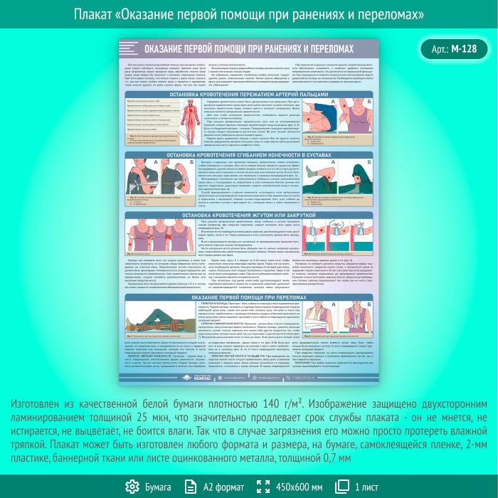 Плакат «Оказание первой помощи при ранениях и переломах» (М-128, ламинированная бумага, А2, 1 лист) в Волгограде купить