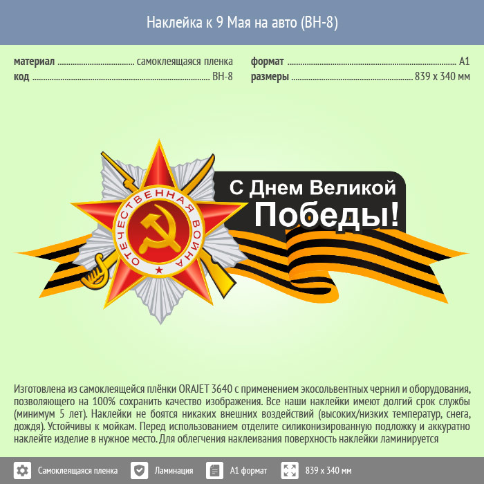 Наклейки к 9 Мая на авто (ВН-8) это замечательный способ выразить благодарность ветеранам ВОВ, знак памяти об их великом подвиге