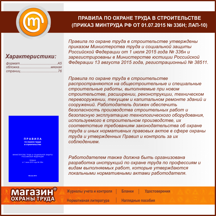 Правила по охране труда в строительстве (Приказ Минтруда РФ от 01.07.2015 № 336н) (ЛАП-10) в Волгограде купить