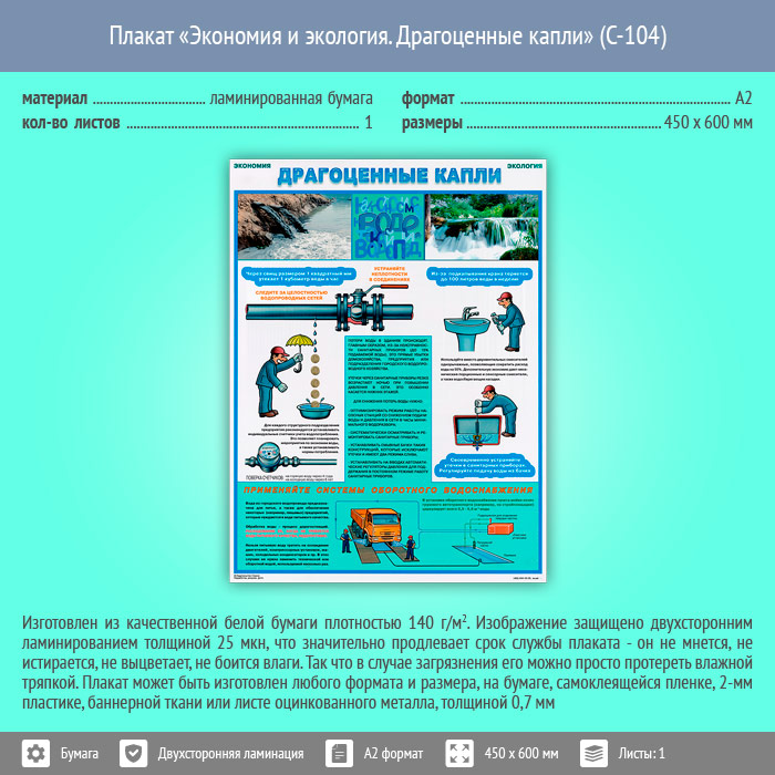 Плакат «Экономия и экология. Драгоценные капли» (С-104, ламинированная бумага, А2, 1 лист) в Волгограде купить