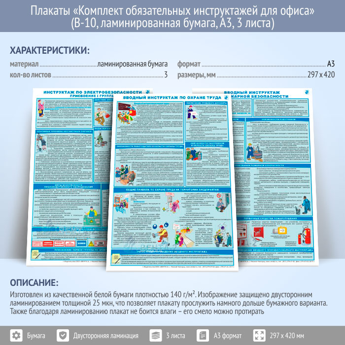 Плакаты «Комплект обязательных инструктажей для офиса» (В-10, ламинированная бумага, А3, 3 листа) в Волгограде купить