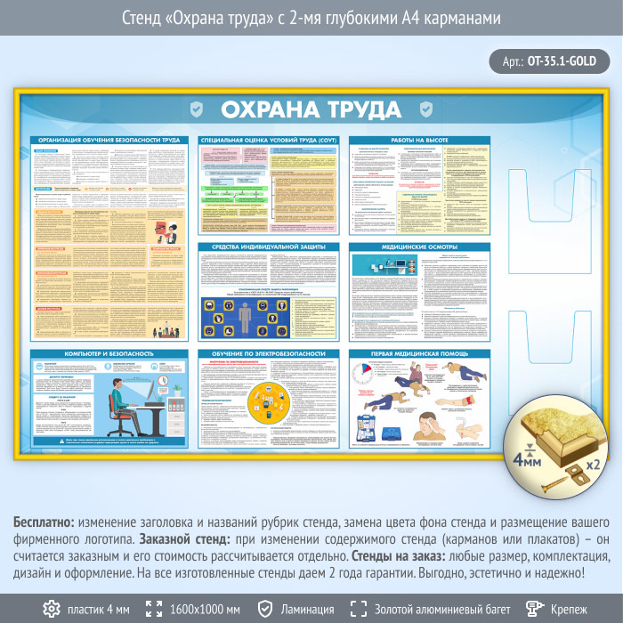 Стенд «Охрана труда» с 2-мя глубокими А4 карманами (OT-35.1-GOLD) в Волгограде купить