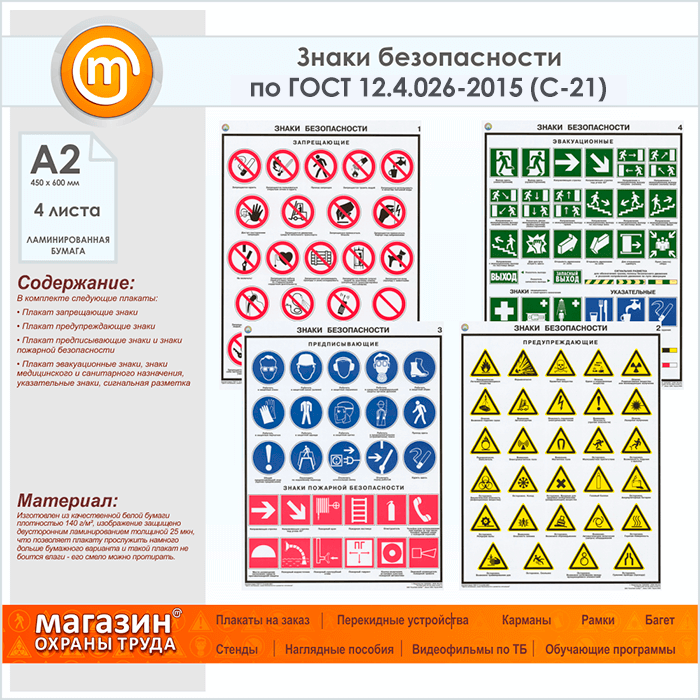Плакаты «Знаки безопасности по ГОСТ 12.4.026-2015» (С-21, ламинированная бумага, А2, 4 листа) в Волгограде купить