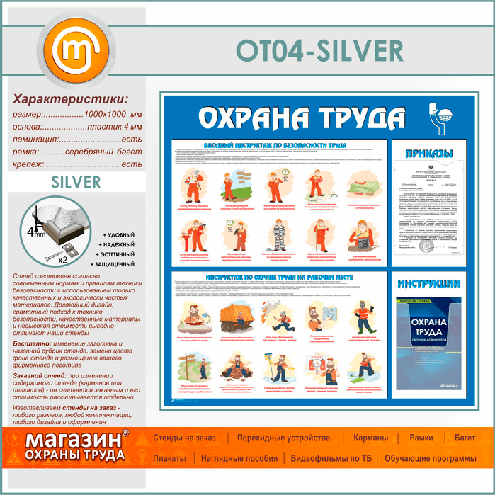 Стенд «Охрана труда» с плоским и объемным карманами (OT-04-SILVER) в Волгограде купить