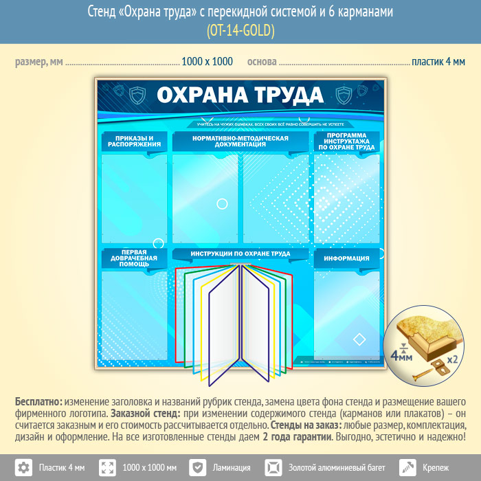 Стенд «Охрана труда» с перекидной системой и 6 карманами (OT-14-GOLD) в Волгограде купить